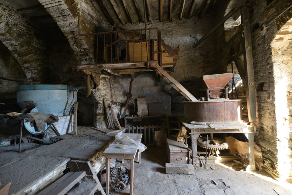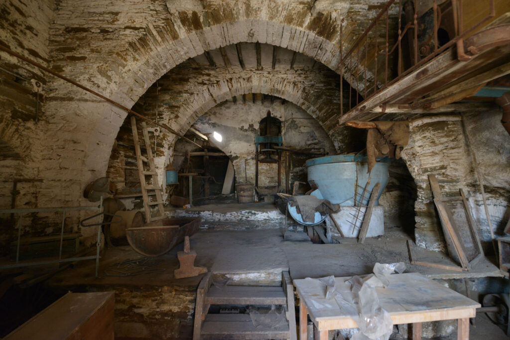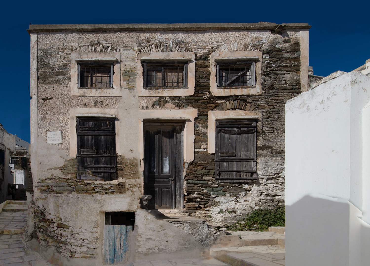 The forge of Yiannis Rigos -Hianis (other word for blacksmith)- was located in the village of Ysternia in Tinos, it was probably the first workshop of the family and was built, something rare for the time, to function as a pre-industrial space from the beginning – with a grinding mill and a blacksmith shop, a mill was added later. The exact date of its construction, has not been established. It is a large building. It includes a large central area and ancillary areas around the perimeter. At the front it includes large windows that allowed light to enter the space. The workshop was famous for the making of agricultural tools but in it many objects were made like quarrying and marble craftsmen’s tools, utilitarian and decorative objects on top of anything needed.