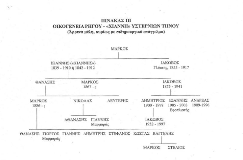 Ioannis Rigos or Hyannis (1839 – 1910 or 1842-1912) learned the art of blacksmithing from his father and perfected it in Syros where he worked at a young age. Returning to Ysternia, he opened a smithy. His brother was the sculptor Iakovos Markou Rigos. He married and had nine children, three boys and six girls and his three boys became blacksmiths, Thanasis and Markos born in 1867, and Iakovos-Giakoumis born in 1873.